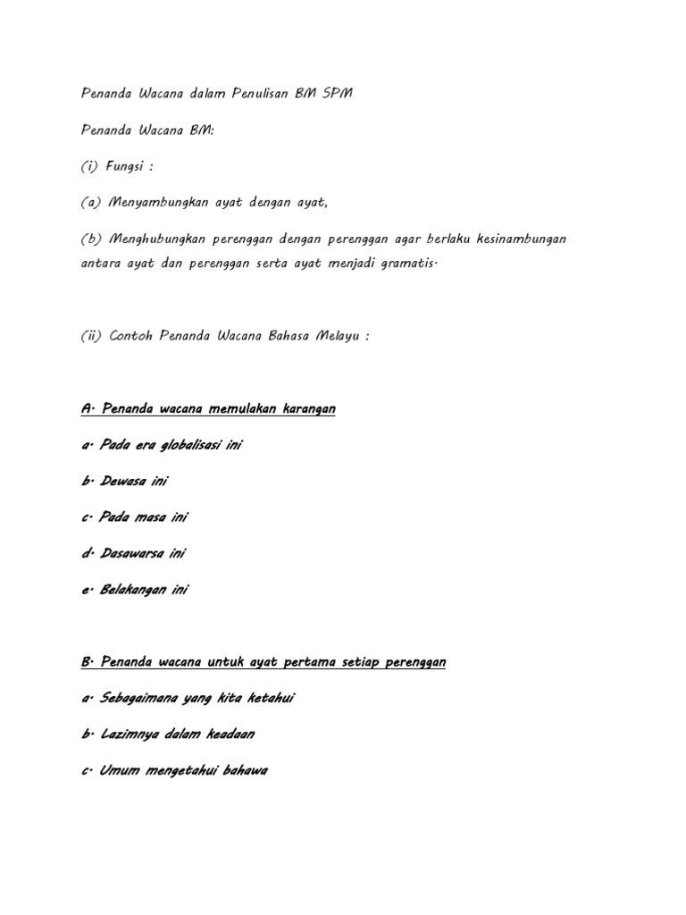 Ayat 1 A1 isi utama Ayat 2 A2 mengapa Ayat 3 A3 bagaimana Ayat 4 A4 contohbukti 1. Oleh itu kebaikan dan keburukan yang mewarnai fokus perbincangan akan dihuraikan dengan terperinci demi kebaikan bersama. PANDUAN MENULIS KARANGAN PENDAHULUAN i PENANDA WACANA UNTUK MEMULAKAN AYAT PENDAHULUAN KARANGAN perenggan pertama aPada era globalisasi ini b Pada zaman pascakemerdekaan ini c Dalam meniti arus kemodenan ini d Dewasa ini e Pada masa ini f Kini g Dasawarsa ini h Dalam meniti kehidupan pada marcapada i Sejak sedekad yang.